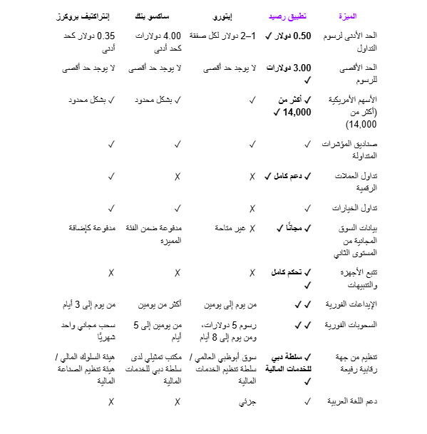 عبر 13 معيارًا للمقارنة، يُعد تطبيق رصيد المنصة الوحيدة التي تتصدر جميعها في الوقت نفسه. فقد يوازيه بعض المنافسين في بُعد أو بُعدين، فهناك من قد يقدم رسومًا أقل على الصفقات الصغيرة، أو من يدعم العملات الرقمية إلى جانب الأسهم. لكن لا توجد منصة تطابق حاليًا الجمع الذي يقدمه تطبيق رصيد بين هيكل الرسوم، والتغطية الكاملة للأصول، وبيانات السوق المجانية من المستوى الثاني، والتداول على مدار الساعة، والإيداعات والسحوبات الفورية، وأمان الأجهزة، والتنظيم من قبل هيئة الخدمات المالية في سيشيل.