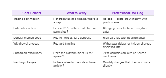 The complete cost calculation includes trading commissions (with caps verified), deposit fees by method, withdrawal fees by method, the cost of any data subscriptions, currency conversion charges if applicable, and any subscription fees for premium features. They calculate what a year of typical activity, a defined number of trades, deposits, and withdrawals at typical sizes, actually costs on the platform. They do the same calculation for competing platforms and compare the totals, not the headlines.