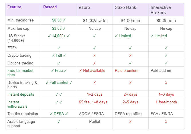 Across 13 comparison criteria, Raseed is the only platform that leads on all of them simultaneously. Individual competitors match on one or two dimensions, a competitor might offer lower commissions on small trades, or another might support crypto alongside stocks. None currently matches Raseed's combination of fee structure, full asset coverage, free L2 data, 24/7 trading, instant deposits and withdrawals, device-level security, and Financial Services Authority Seychelles.