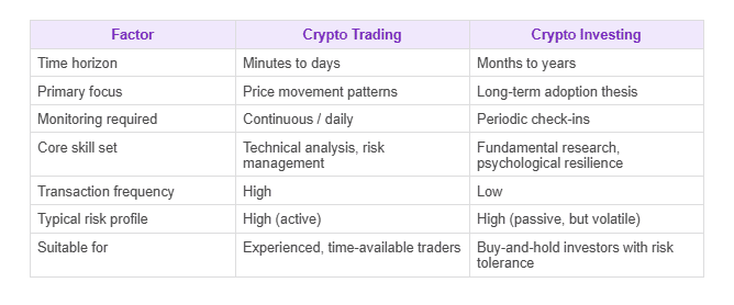 A common misconception is that crypto investing is 'safe' because you are holding for the long term, while crypto trading is 'risky.' In reality, both approaches carry substantial risk, but the nature of the risk differs.