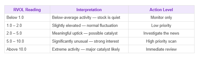 Most professional scanning tools display RVOL in real time. Here is a quick reference for interpreting the numbers: